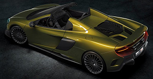 The McLaren 675LT Spider is a special model, limited to just 500 units. It is based on the 650S but is more powerful, lighter and track-focused.The exterior includes a newly designed front splitter, Formula 1-style nose end-plates and larger 'Longtail' Airbrake. The rear deck is also new. These bodywork changes contribute to a significant increase in downforce levels, up 40 percent over the 650S. Weight has been reduced by 100 kg through the increased usage of carbon-fibre and by lighter components throughout, including newly developed suspension geometry derived from the McLaren P1. The windscreen is 1 mm thinner, saving 3 kg, while the rear bulkhead glass is 0.5 mm thinner, saving a further 500 g. The weight saving measures also include a louvred polycarbonate engine cover. These revisions to the glazing save a combined 4.7 kg. The cabin is upholstered in lightweight Alcantara, and features a four-speaker Meridian hi-fi and a satellite navigation system as standard. Front and rear...