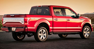 The Ford F-150 is new from the ground up for 2015. Starting from its redesigned steel ladder-frame chassis, every aspect of the truck is new, including a shift to aluminium body construction and a general push towards "EcoBoost" turbocharged engines. Available in single cab, "SuperCab" quad-cab and "SuperCrew" double-cab body styles, engines on offer include a 3.5-litre V6, a 2.7-litre turbo V6, a 3.5-litre turbo V6 and a 5.0-litre V8, all with 6-speed automatics. Further configurations include a choice of rear-wheel-drive or four-wheel-drive with low-range, while an "FX4" package can add offroad suspension, rear locking diff and skidplates to any model except the base one. Aside from the usual basic features such as power windows, keyless entry and electric mirrors, new features, depending on trim level, include remote tailgate locking and release, unique "BoxLink" tailgate attachment points that accept standard attachments used in moving trucks and trailers, stowable loading ramps...