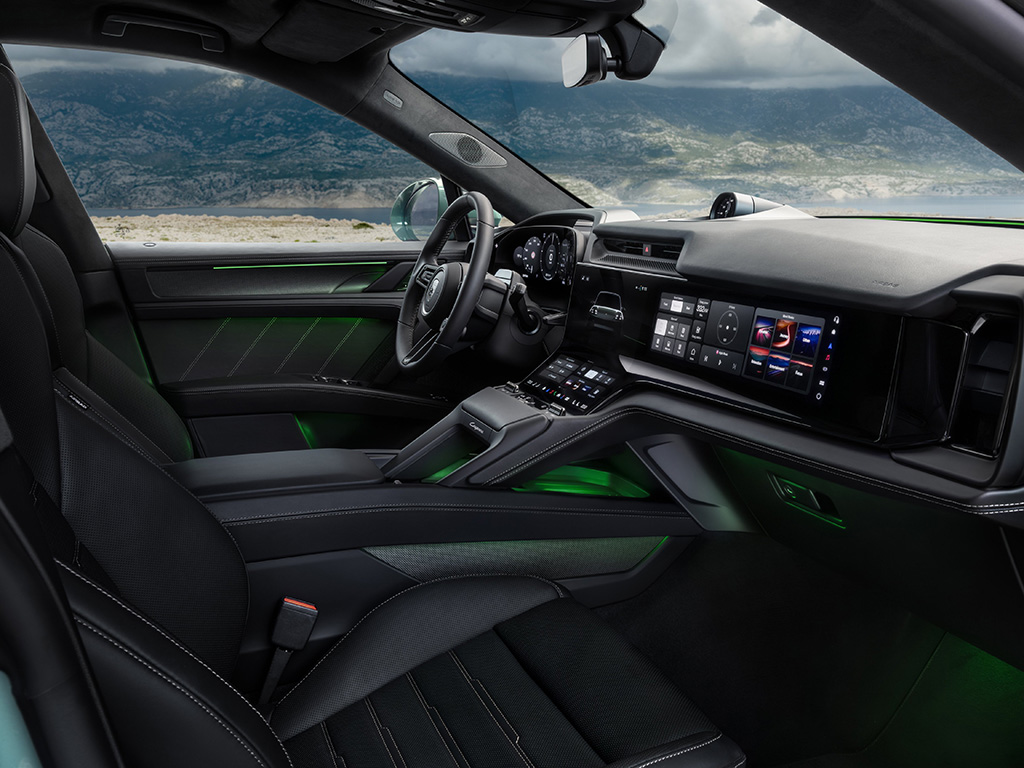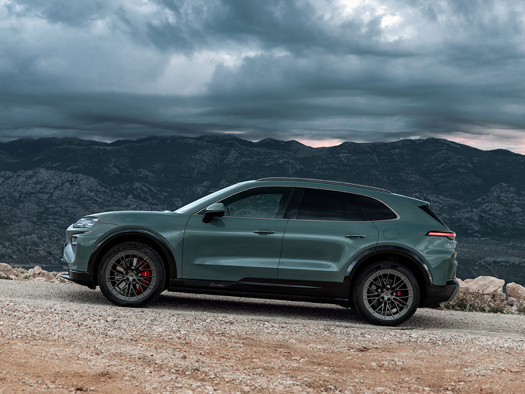 The model uses two permanent magnet synchronous motors for all-wheel drive, paired with a function-integrated 113 kWh battery featuring a dual-sided cooling system. Output ranges from 436 hp in the standard model to 1140 hp in the Turbo with Launch Control. Acceleration is rated at 4.8 seconds and 2.5 seconds respectively, with top speeds of 230 kph and 260 kph. Preliminary WLTP range figures stand at 577–642 km for the Cayenne Electric and 566–623 km for the Turbo. Both can tow up to 3,000 kg, or 3,500 kg with the optional off-road package.