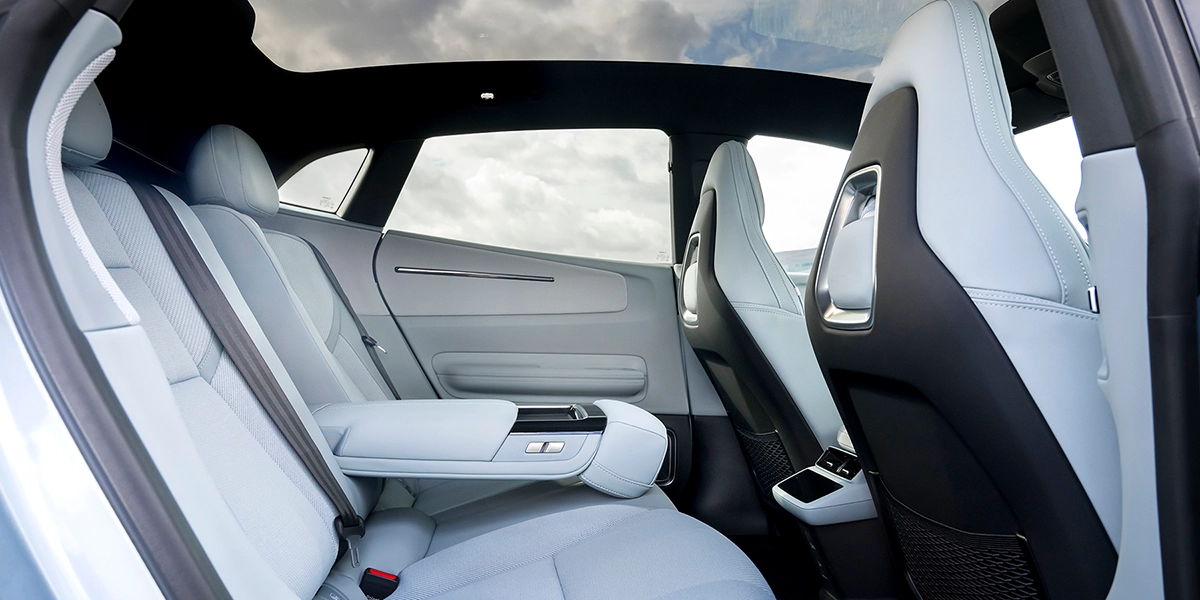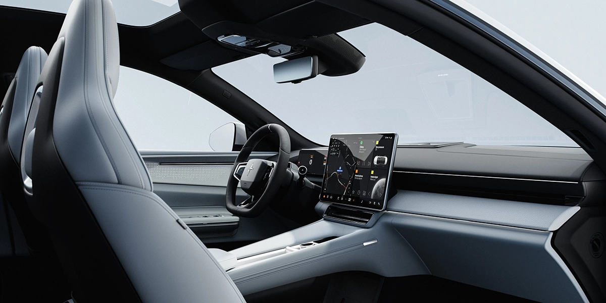 The Polestar 4 features clean Scandinavian styling with a low, wide stance and a minimalist silhouette. Its most distinctive feature is the absence of a traditional rear window — instead, a roof-mounted high-definition camera feeds a live view to a digital rearview mirror, providing an uninterrupted and wider field of vision. The 4.8-metre-long SUV sits under 1.5 metres tall, giving it a sporty, coupe-like profile. Signature design cues include dual-blade headlights, frameless side mirrors, and an illuminated Polestar logo on the front. Pixel LED headlights with adaptive high-beam are available as an option.