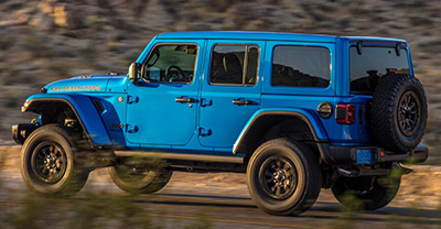 In 2021, Jeep released the Wrangler Rubicon 392. It comes with the HEMI 6.4-litre V8 engine, mated to an 8-speed automatic transmission. Unlike the Grand Cherokee SRT, the Rubicon 392 still maintains all its off-road capabilities. It gets 17-inch beadlock capable wheels and 33-inch tyres. The functional hood scoop called the "Hydro-Guide Induction System" enhances engine performance, as cooler, less dense air helps lower engine temperature and the system helps separate water from the intake while traveling in wet conditions. There is a dual-mode exhaust system, which can open up the valves with the touch of a button to make it louder. Inside, it gets seat bolsters, embroidered black leather-trimmed seats, custom bronze stitching, steering wheel-mounted paddle shifters, a premium audio system and the Uconnect 4C NAV with its 8.4-inch touchscreen. Safety features include four airbags, ABS, stability control, and brake assist.