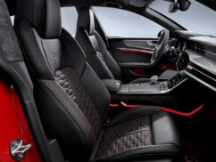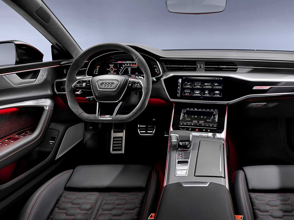 في الداخل، تأتي RS7 بتنجيد Nappa جلدي أسود لمقاعد RS سبورت و عجلة قيادة مسطحة من الأسفل. و وجدت شاشة MMI الثنائية و نظام قمرة القيادة الافتراضي طريقها الى المقصورة. للحفاظ على هويتها من المس تنتشر شعارات RS داخل المقصورة كجزء من التصميم. فيما يميزها من الخارج الطلاء الخاص ناردو الرمادي، و سيبرنغ الأسود الى جانب 13 خيار آخر متوفر.