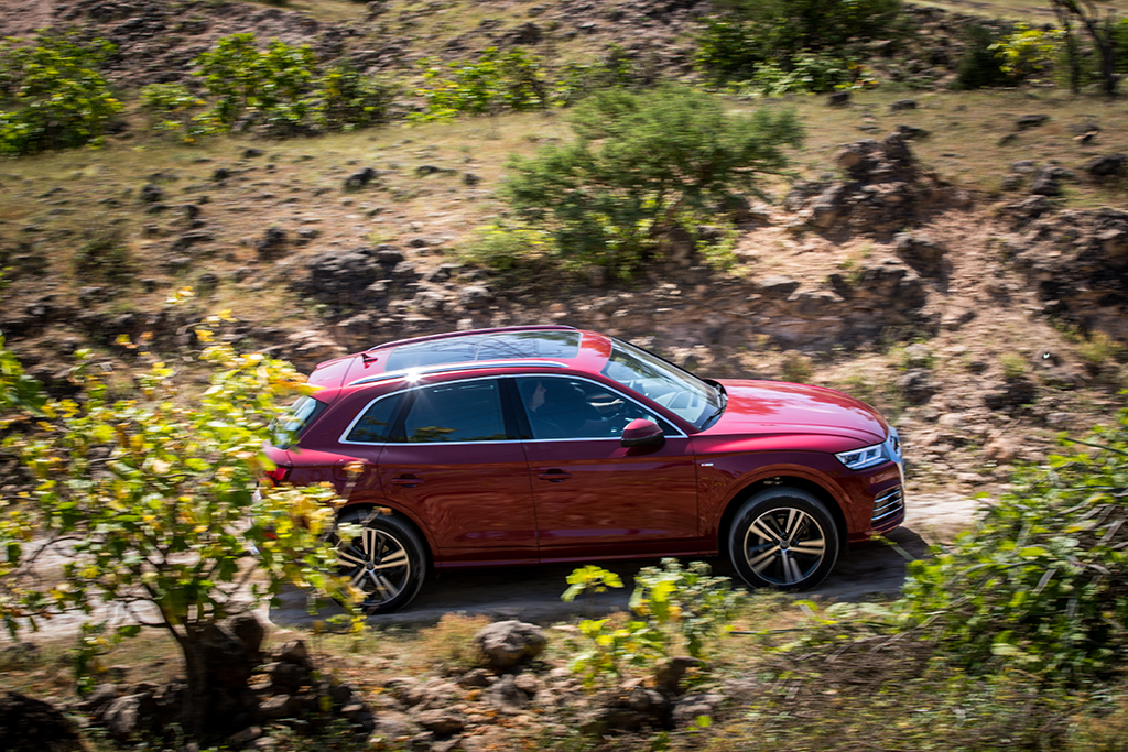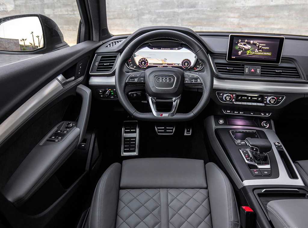 و على الفور ستتمكن من تمييز الفارق بالقوة عند الاندفاع، مع اصدار العادم لصوت هدير بسيط يهدف الى تذكيرك بأنك تقود الطراز S منها، مع هذا فالتماسك الجيد أصلاً شبيه تماماً بما تقدمه Q5 القياسية. كما حظي تصميمها الخارجي بمظهر أكثر غضباً، مع مصدات رياضية، و أقراص فرامل حمراء، و سبويلر أكبر، و عجلات معدنية قياسية بقياس 20 بوصة. و الجانب السلبي الوحيد هو وجود ماسورة عادة ثنائية مزيفة ضمن المصد الخلفي و التي يتوارى أنبوب العادم الأصلي أسفل منها. و أتت سيارتنا الاختبارية بعجلات اختيارية بقياس 21 بوصة. الى جانب مقاعد بنزعة رياضية مكسوة بجلد Nappa، مع مزيد من التدعيم و لكن بالتأكيد مع نقص في مستوى الراحة.