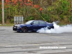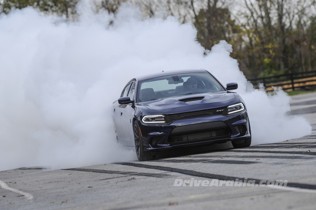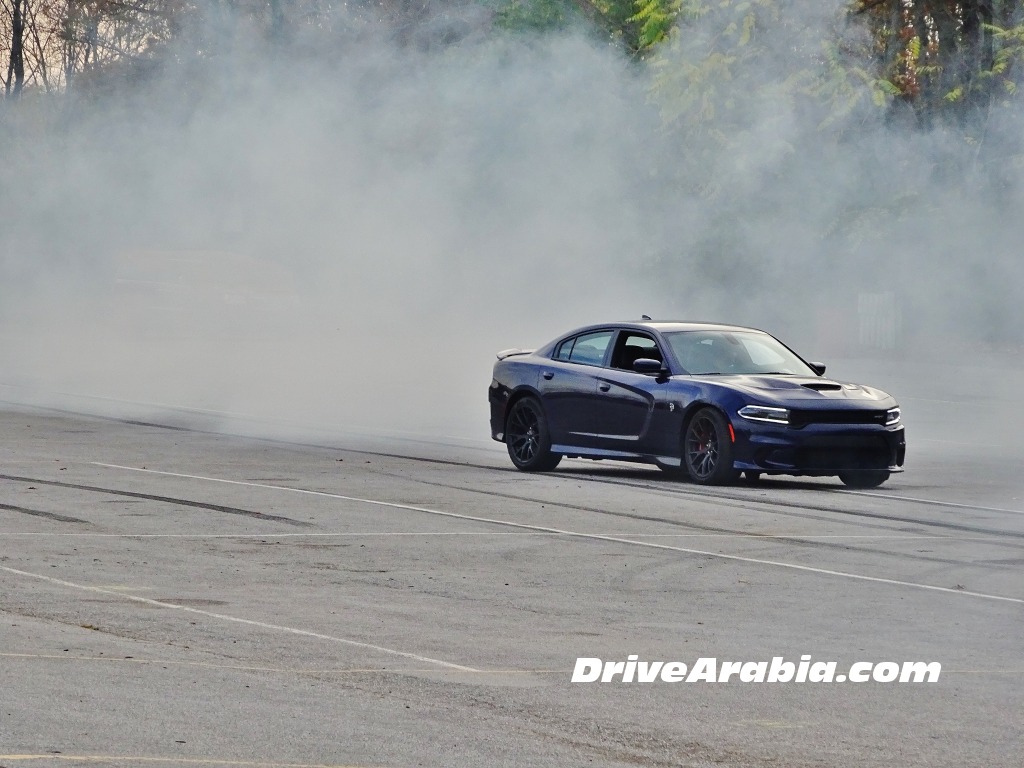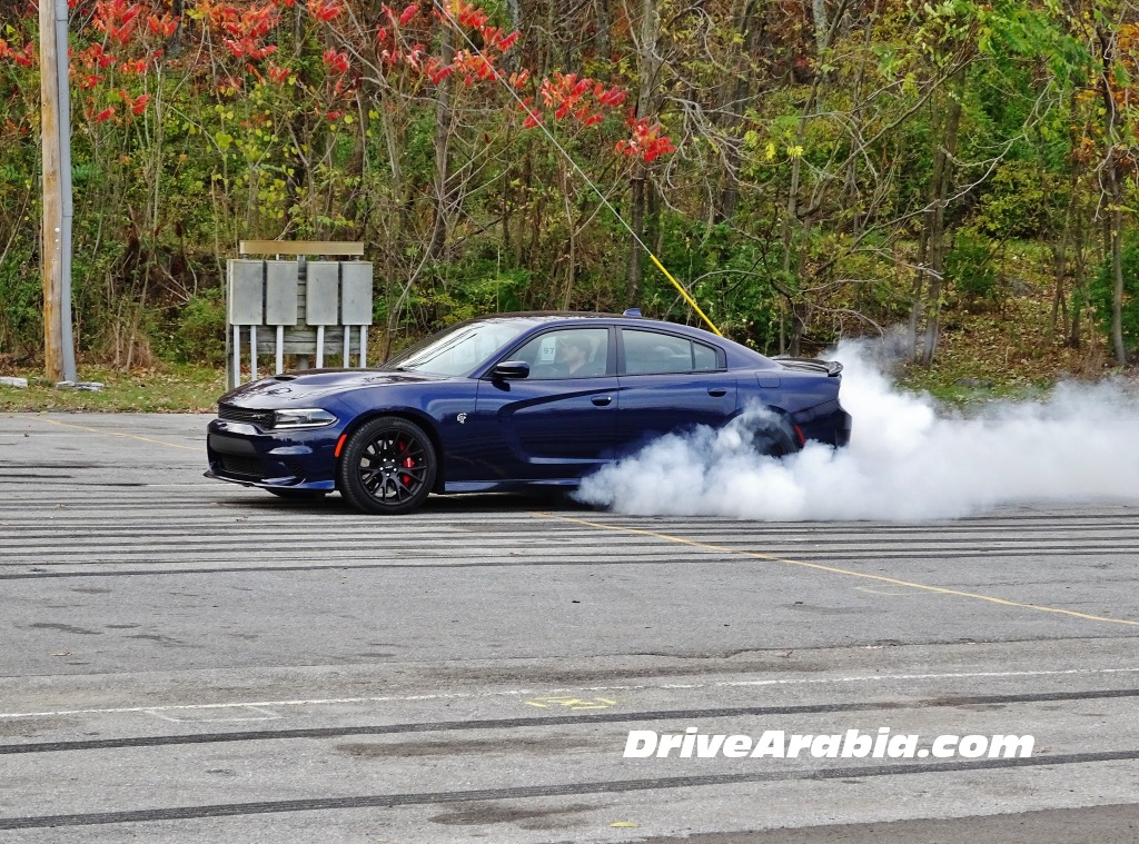 هذا بالنسبة للفرملة، أما عن التحكم، فلطالما كانت سيارة تشارجر بعلامة SRT ذات تحكم مثالي، حيث تقدم الـ Hellcat ما هو متوقع منها تماماً، القوة التدريجية عند الخروج من المنعطفات مع كل ما تحتاجه من السيطرة. كما أن السيارة ممتازة في “التفحيط” وغزل العجلات بحسب ما رأينا لاحقاً في ذلك اليوم، لكن ليس من السهل أن تُخرج الغضب الكامن في هذه السيارة إذا كنت قد انطلقت في قيادتها ولم تبدأ بهذا الأسلوب من القيادة قبل الانطلاق. وعلى الرغم من حجمها تقوم السيارة بالانطلاق والتسارع بشكل مثالي دون أن تتأثر بوعورة الحلبة التي تعتبر قديمةً نسبياً. ولا يسعني أن أتخيل حدود هذه السيارة، لكنني وبمتابعة عيني المراقب لكل حركة أقوم بها، لم أقم بأي شيء أكثر من الانعطاف بسرعة عالية والشعور الرائع الذي يصاحبه ذلك.