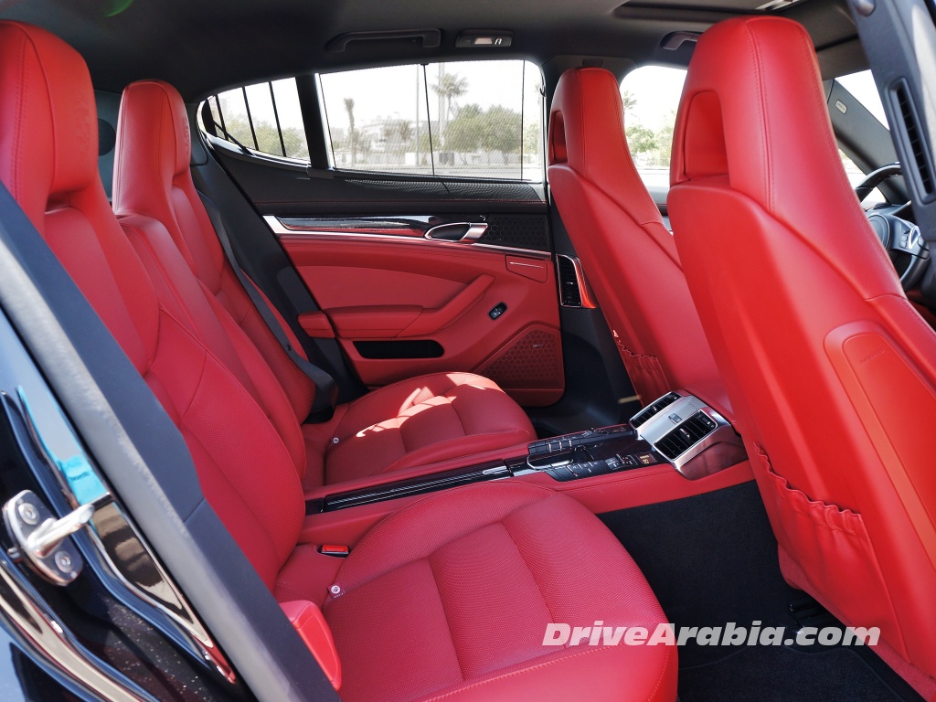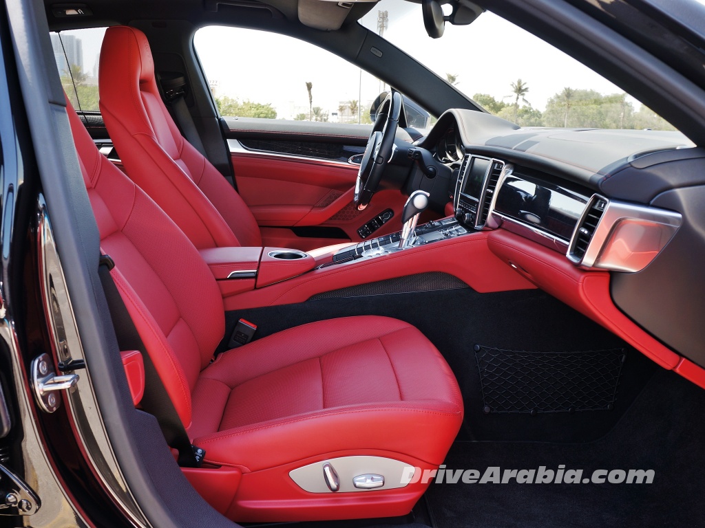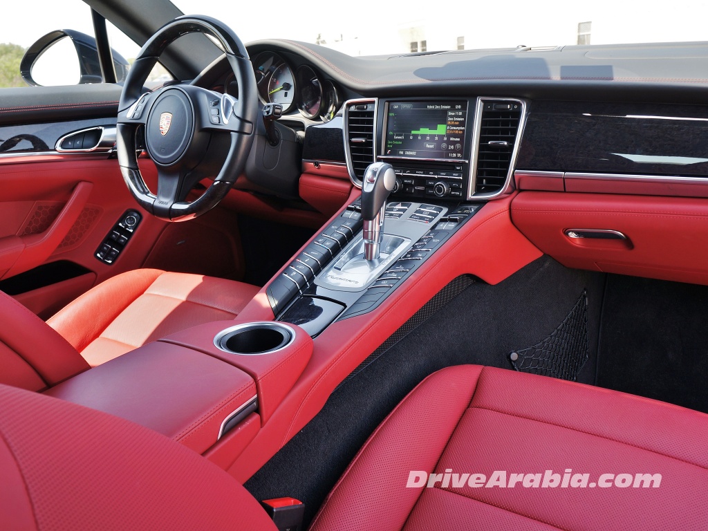 كما يوجد جيوب في متناول اليد في ظهر المقاعد الأمامية وكل الأبواب أيضاً، بالإضافة الى فسحة صغيرة في مسند الذراع الذي يحوزهاتف لا سلكي على معظم مساحته. السيارة رحبة وواسعة من الأمام اذ تبدو المساحة المخصصة للذراع مرضية لكل الركاب، على الرغم من لمحة الأريحية المنخفضة بيد أن المساحة المخصصة للأرجل في الخلف متوسطة، على الرغم من ذلك مازال بالإمكان ايجاد مساحة لصواني يمكن طيها وحاملة كأس واحدة على حساب المقعد المركزي في المنتصف، بشكل جوهري فهذا يجعلها سيارة ذات أربعة مقاعد بتصميم رياضي مع مساند رأس ثابتة. اما غطاء الصندوق الخلفي فهو ذو نمط فتح آلي و الذي يفضي الى صندوق خلفي مفروش طويل ولكن قليل العمق، بسبب المكان المخصص للبطاريات تحت أرضيته، لذلك فإن حمولة صندوق الأمتعة أقل من تلك الموجودة في باناميرا غير الهجينة.