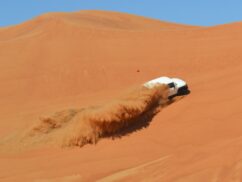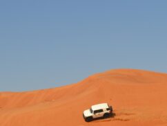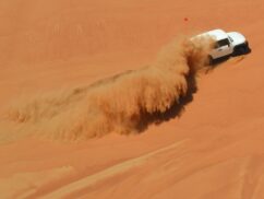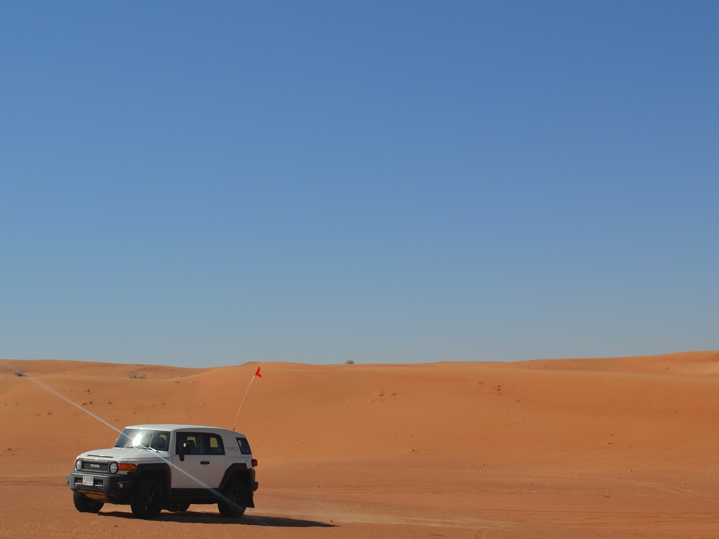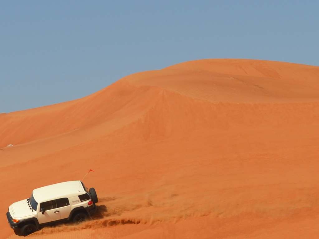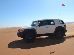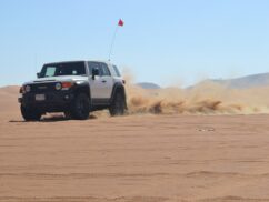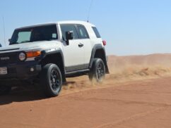 إنه معروف أن سيارات تويوتا ذات الدفع الرباعي جبارة في الصحراء، لذلك هي محبوبة جدا بالوطن العربي، بالذات سيارة FJ. ومن السهل فهم السبب بعد قيادة السيارة بالصحراء. المحرك القوي يساعد السيارة على تخطي الصعوبات والكثبان الرملية الصعبة. على سبيل المثال، أثناء قيادة السيارة في الصحراء لمدة تتعدى أربع ساعات لم تواجهنا أي مشاكل مع السيارة حتى في مجال الحرارة، حافظة السيارة على حرارتها و أدائها بغض النظر عن الضغط على المحرك و حرارة الشمس. حجم الزجاج الأمامي و زاويته يساعد جدا على زيادة الرؤية المحيطة أثناء القيادة بالصحراء، هذا مع المصد الأمامي يدفع السائق لقيادة السيارة بثقة أكثر. نظام التعليق في السيارة أكثر ليونة مما هو معتاد، هذا يجعل السيارة ترتد على الصعود والنزول أكثر من اللازم. ولكن هذا يجعل السيارة مريحة أكثر عند قيادتها بشدة فوق الكثبان الرملية.