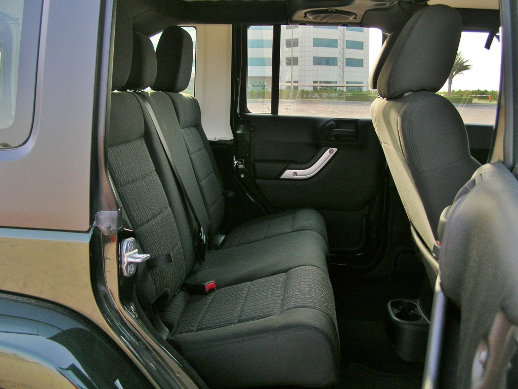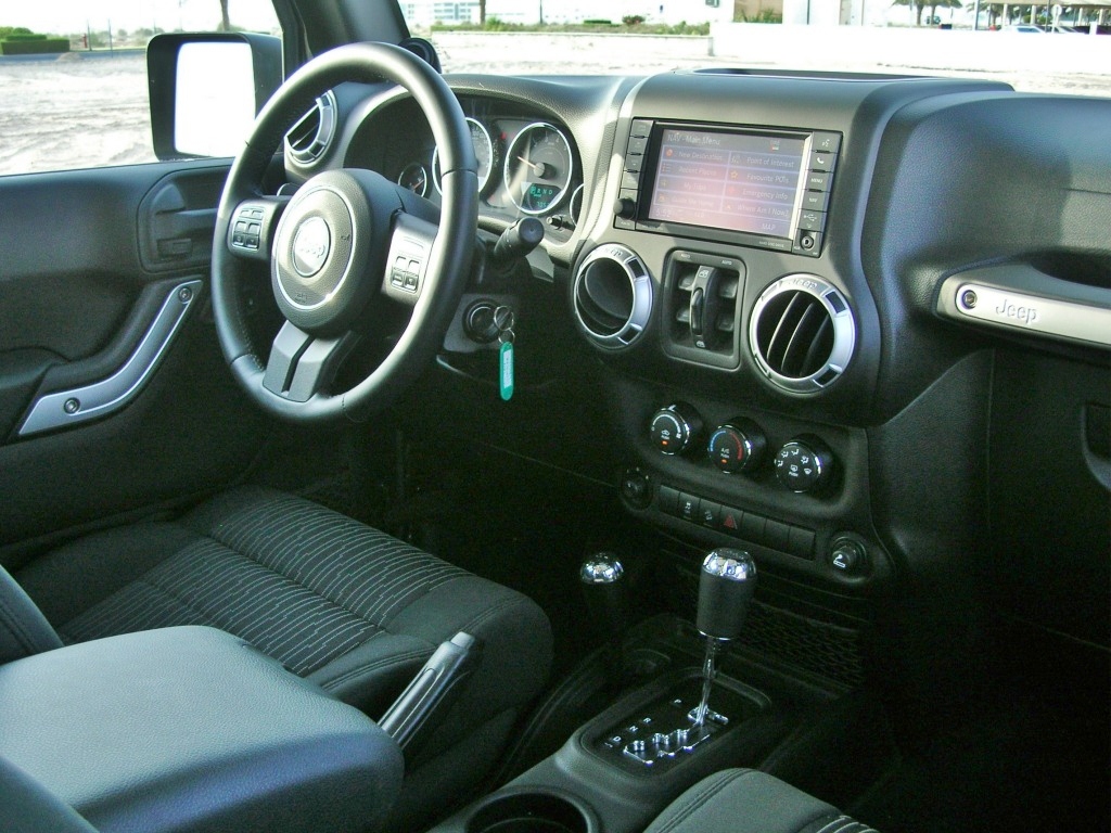 The new interior is more pleasant than before, with more rounded edges, more metal-look plastics and even padded armrests for once. There are still the old Wrangler oddities, such as the cloth straps on the door hinges, the huge panel gaps in various places, the hard-plastic dash, the full rollcage with zip-on padding and the patchy build quality, but there again, this is probably the only car that has removable doors and a flip-down windshield, not to mention that removable multi-piece roof.