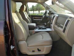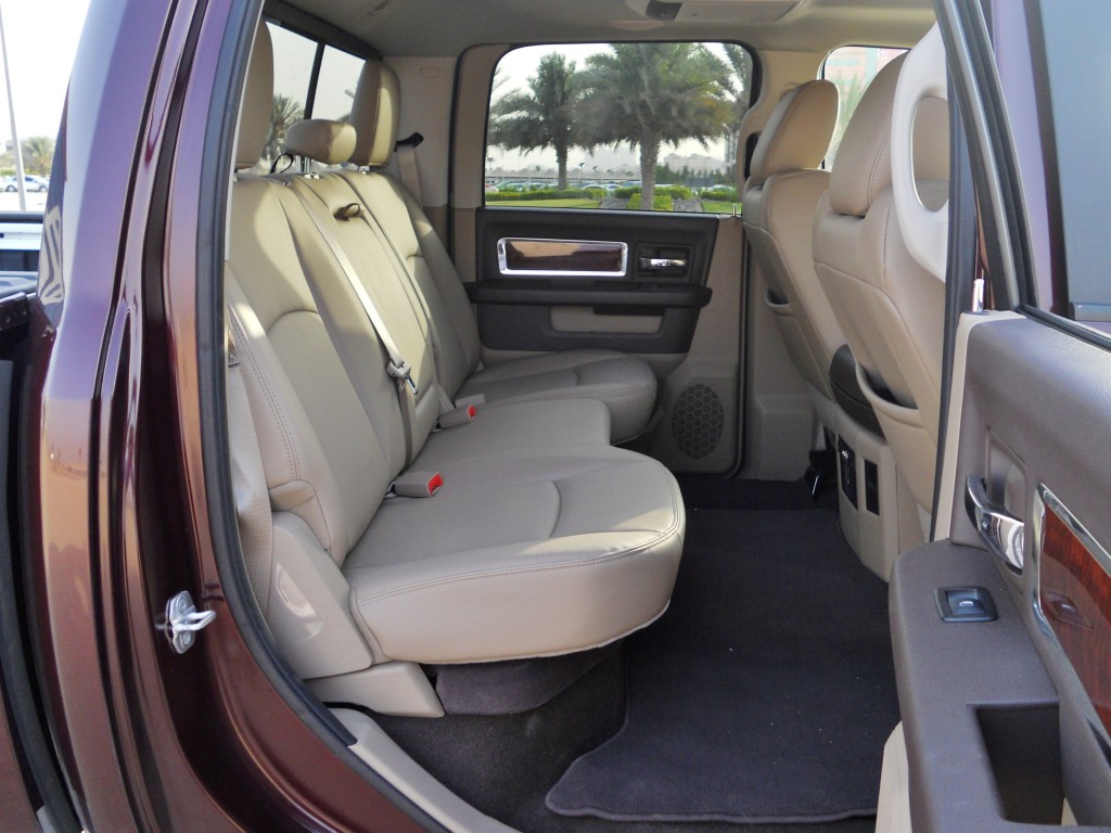 Inside, the Ram easily has the best interior in its class. While the “others” simply have a hard-plastic cabin with leather seats, the Ram actually has a padded leatherette dash, as well as padded armrests, soft-touch front door trim and bits of faux wood. There’s no soft-touch on the rear doors, but all three rear passengers still get individual headrests.
