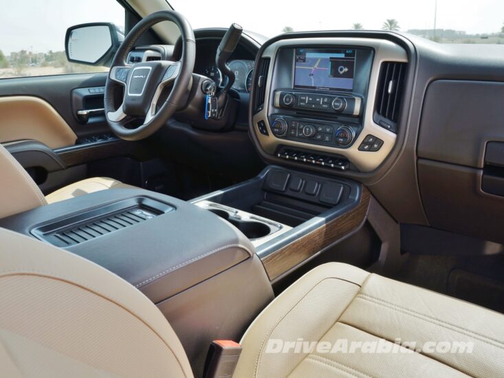 When the big doors are opened, a powered side-step pops down automatically, making entry easy even for shorter folks. Inside, the Sierra’s interior is identical to the Chevy Silverado, but only in terms of the general design.