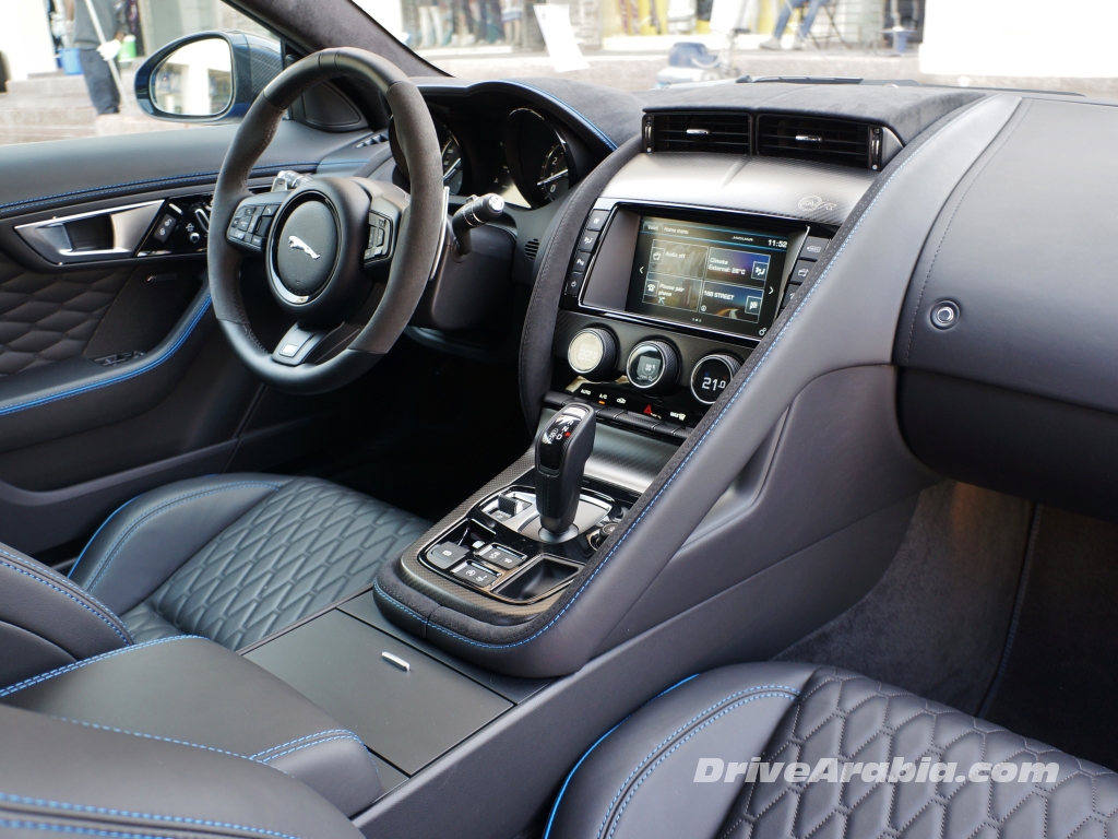 Externally, the SVR doesn’t look hugely different from the regular F-Type, except for the very obvious rear spoiler replacing the pop-up flap. Look closer and you’ll also notice the slightly wider front fenders integrating vents aft of the unique 20-inch wheels as well as larger intakes in the front bumper. The roof can be optioned in glass, metal or carbon fibre. The car looks great, and a bit of a head-turner in its trademark blue colour, but it doesn’t quite look like it could be as pricey as an Audi R8 or a Porsche 911 Turbo (which it is), especially as a new 4-cylinder base F-Type has just debuted with nine-tenths the style at one-third the price.