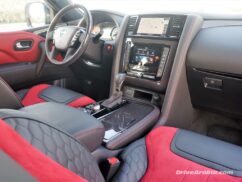 The pricey Patrol Nismo is fully optioned up with everything that a Platinum LE has, with features such as the dual-touchscreen layout, larger LCD screen between the gauges, navigation, around-view 4-camera system, front/rear parking sensors, dual rear DVD screens, ventilated power-adjustable front seats, intelligent key with starter button, remote start, USB port, Bluetooth, Apply Carplay, adaptive cruise control, good stereo, power tailgate, blind-spot monitoring, cross-traffic alert, tyre-pressure monitor, a full set of airbags, a strong tri-zone auto a/c with rear roof vents all the way to the third row, and the world’s tiniest sunroof. Oddly enough, the wireless charger has been skipped.