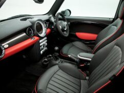 The interior colour comes in black overlaid by subtle red touches. The full leather sports seats come in black with red piping and the red theme is perpetuated with co-ordinating red knee-rolls, armrests and red stitching on the floor mats, gearshift & handbrake gaiters. Fascia, and door grip finishers continue the carbon-fibre theme, as does the John Cooper Works insert on the Sports Steering Wheel, which has an Alcantara rim.