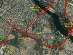 – As you pass under an interchange bridge at Wafi, keep to the two slowest lanes on the right, but keep going straight. Do not take the three fastest lanes, as those eventually head left towards Shk Zayed Road, and you do not want that.
