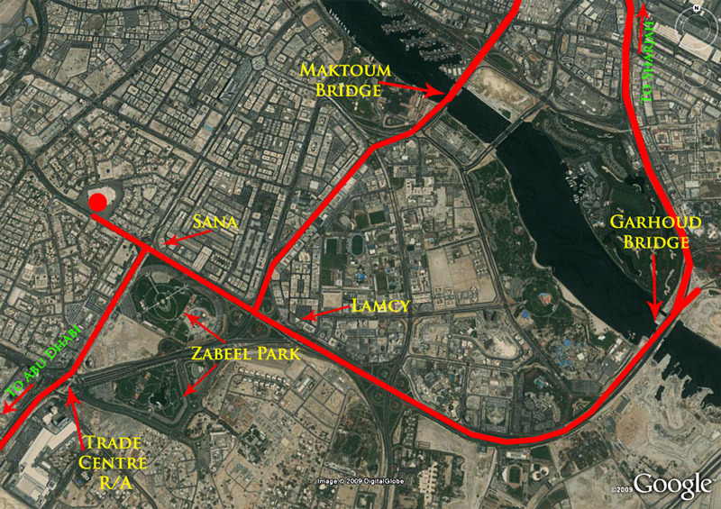 – If coming from Sharjah using the Garhoud Bridge, get off the bridge and keep driving straight.