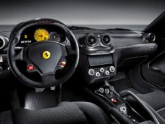 The 599 GTO’s engine is directly derived from the 599XX unit with road-going mods. The 6.0-litre 65-degree V12 engine punches out 670 hp at 8250 rpm with maximum torque of 620 Nm at 6500 rpm. The car also has a racing-type intake system with a new manifold with diffuser-type intake geometry and short inlet tracts designed to improve power delivery at high revs and reduce losses. The engine sound inside the car is carefully controlled to balance the intake sound with the exhaust. The 599 GTO also features lower 60 millisecond shift times via the clutchless manual, with the possibility to make multiple downshifts.