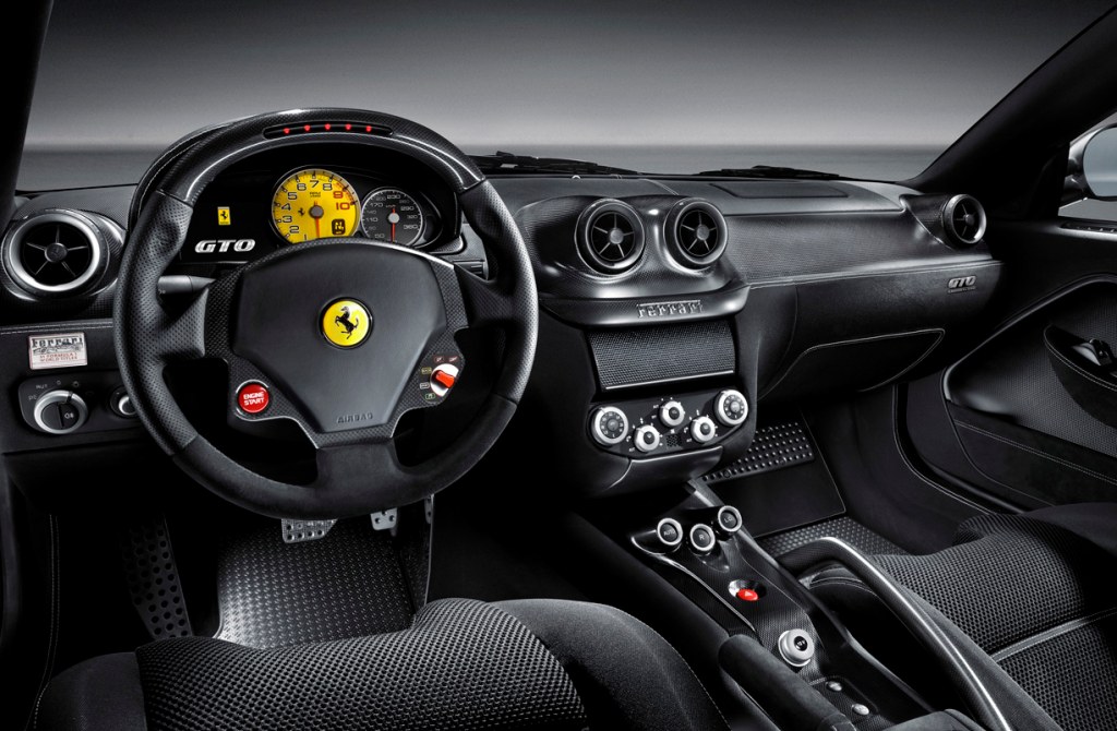 There are various electronic settings to choose the best setup for any specific track. The ICE position on the 599 GTB Fiorano has been replaced by CT-Off (traction control off). The GTO is also fitted with longer carbon-fibre F1 paddles. In addition, the GTO also features the Virtual Race Engineer, a system that monitors the status of the car and gives the driver immediate visibility of vehicle performance.