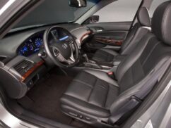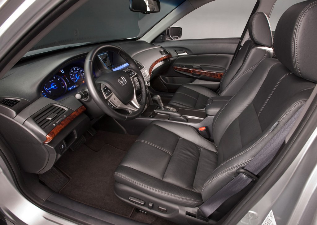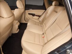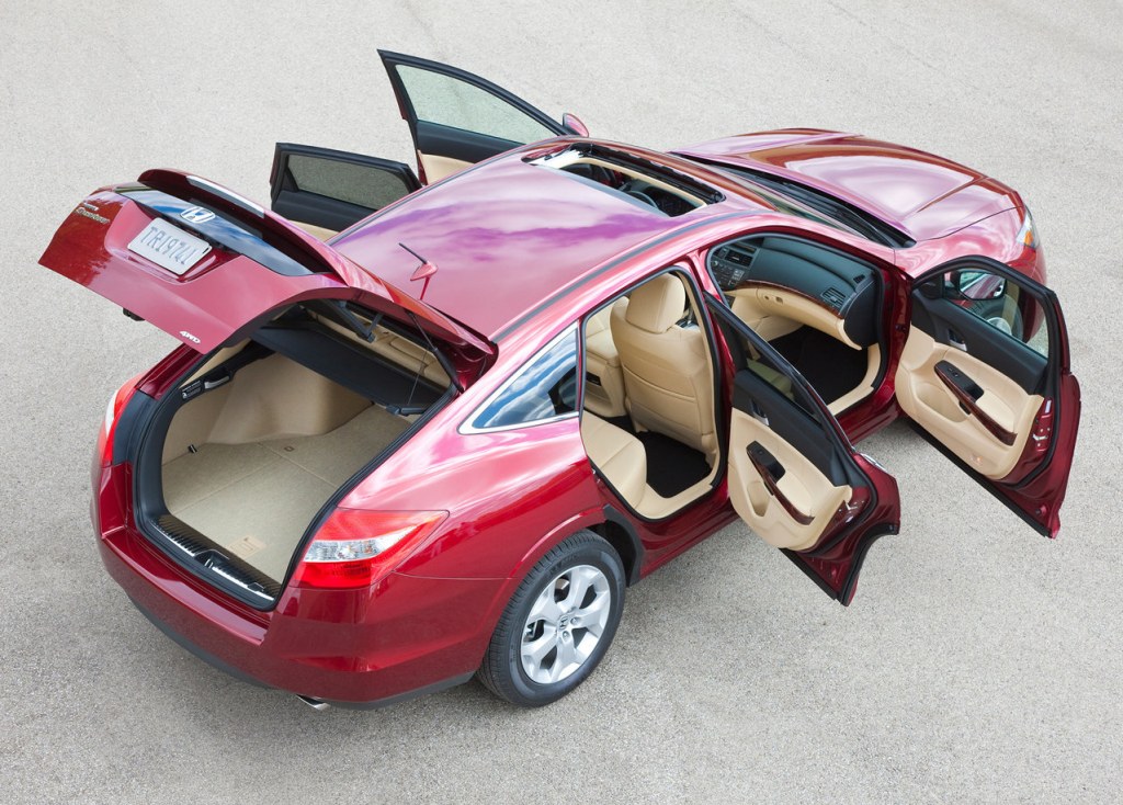 The Accord Crosstour has an interior exactly like that of the sedan, but with standard leather and a differently-shaped roofline. The cargo area has an under-floor storage area in the rear of the vehicle and reversible cargo floor panels for dirty objects. Cargo area access is further enhanced by a tailgate with a large opening and a low lift-over height. Levers near the interior fender wells, accessible from the tailgate opening, allow for one-touch folding of the rear seats into the floor and create 1,452 litres of cargo space in the process. The spare tyre is accessed from the bottom of the car.