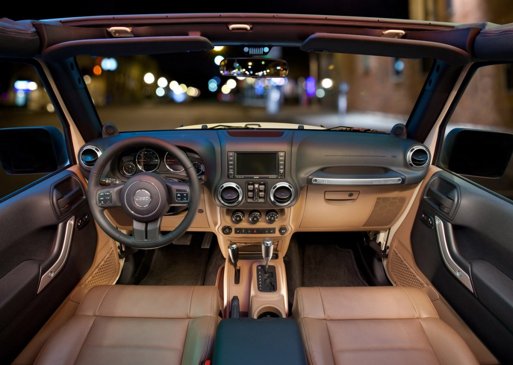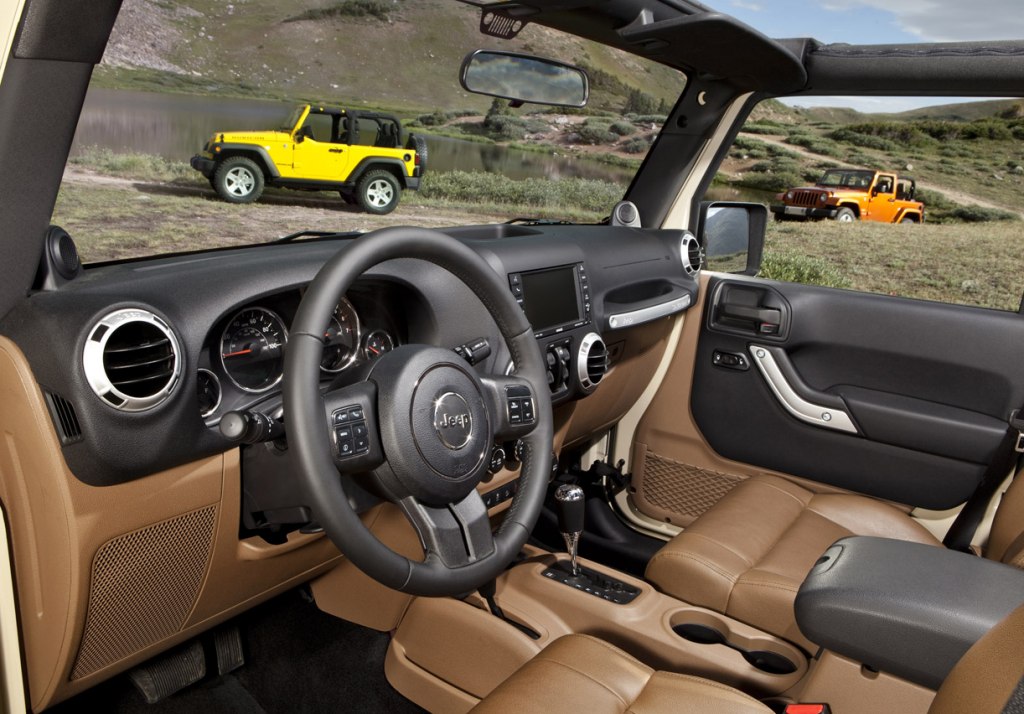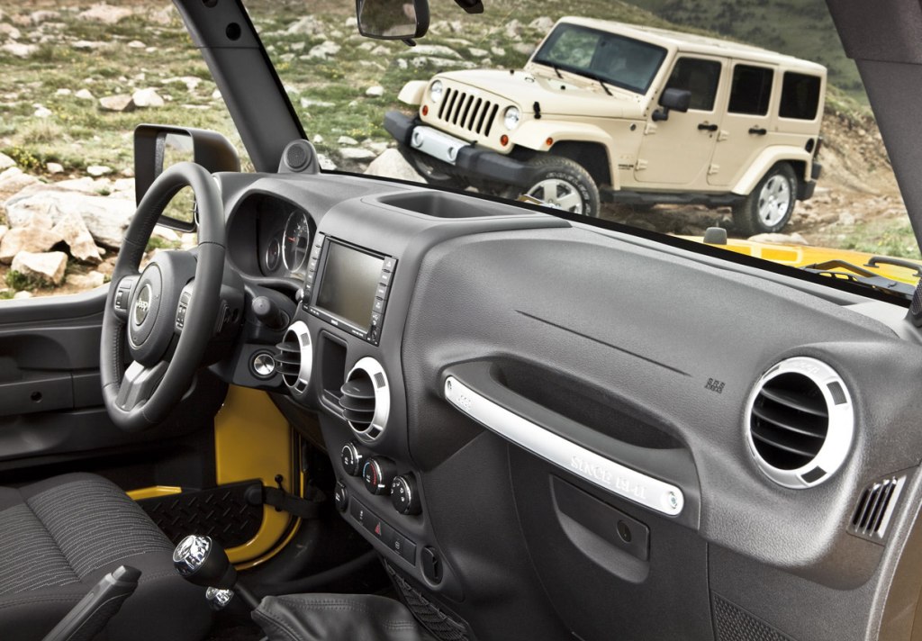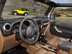 The 2011 Jeep Wrangler interior include a redesigned instrument panel and new storage areas with improved ergonomics and upgraded materials, though still largely hard plastics in keeping with its roots. A new lockable console and upgraded door armrest areas have more comfortable “touch” points, while a redesigned centre stack is easier to reach. Heated power mirrors are now available, as well as larger rear windows. More sound-deadening has also been fitted.