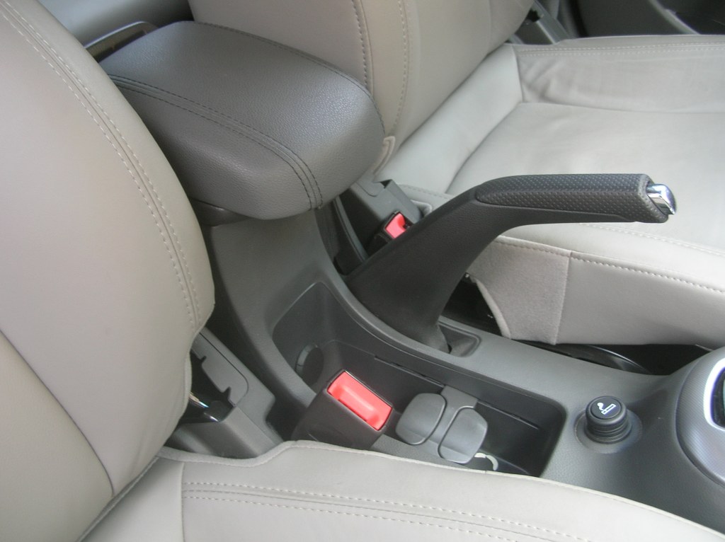Thoughtful touches include the exposed cup-holder whose central divider can slide back and forth to accommodate most drinks. Also, that central armrest can extend forward for better comfort, and covers a deep storage cubby under it. The cubby also contains the AUX port for the stereo. A USB port is optional.