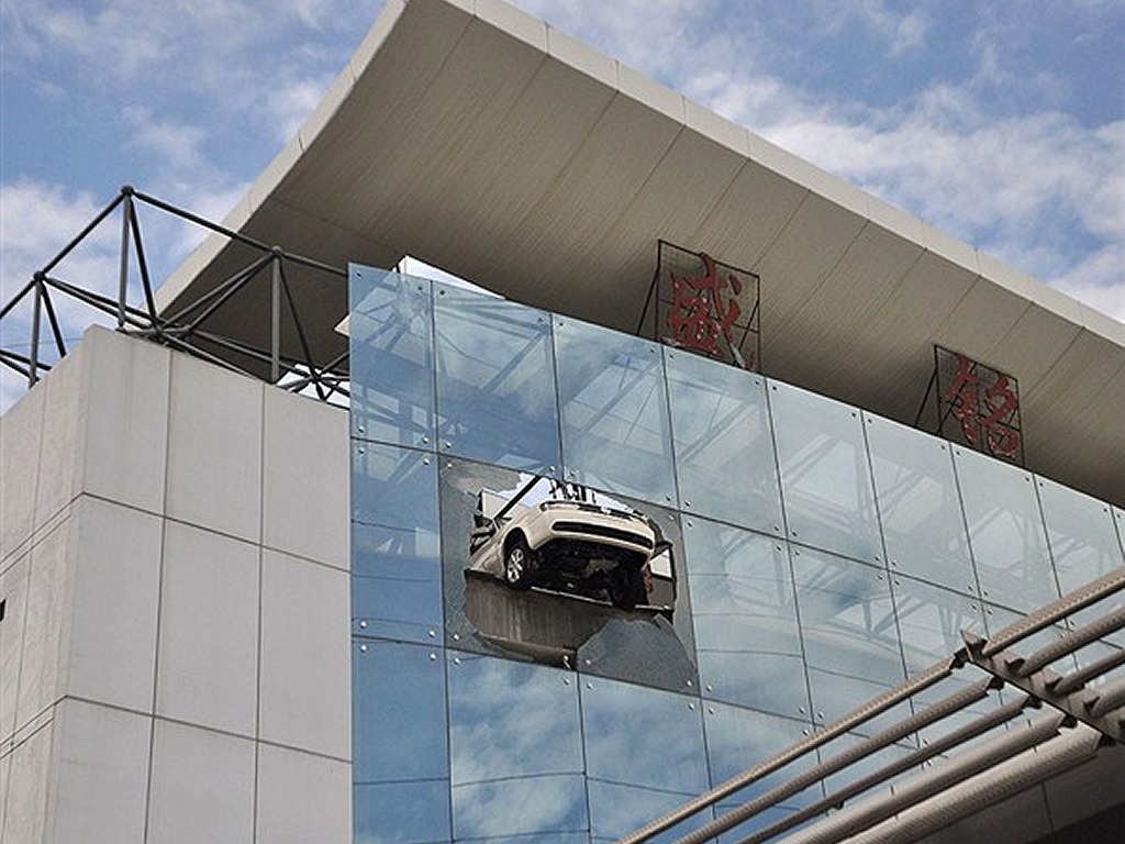 A car buyer in China nearly escaped a ‘great fall’ after he drove a Volkswagen half-way out of a showroom window, located on one of the higher storeys of the building. The showroom salesperson let the customer have his way when he requested to hear the engine noise of the vehicle he was planning to purchase. Of course, what the customer didn’t notice is that the vehicle he was about to check was already in gear. As he started the engine, the car started rolling forward, eventually crashing out of the showroom window, but the customer applied the brakes just in time to stop the vehicle from falling off from several floors above ground level.