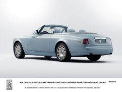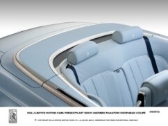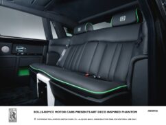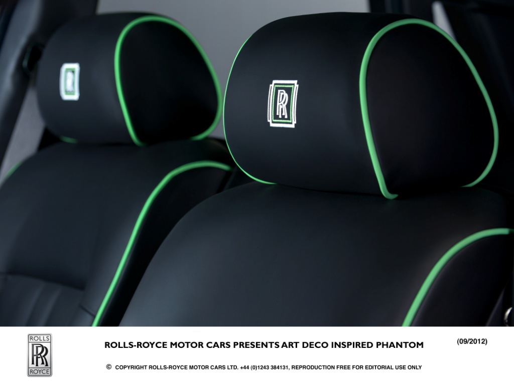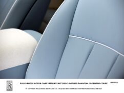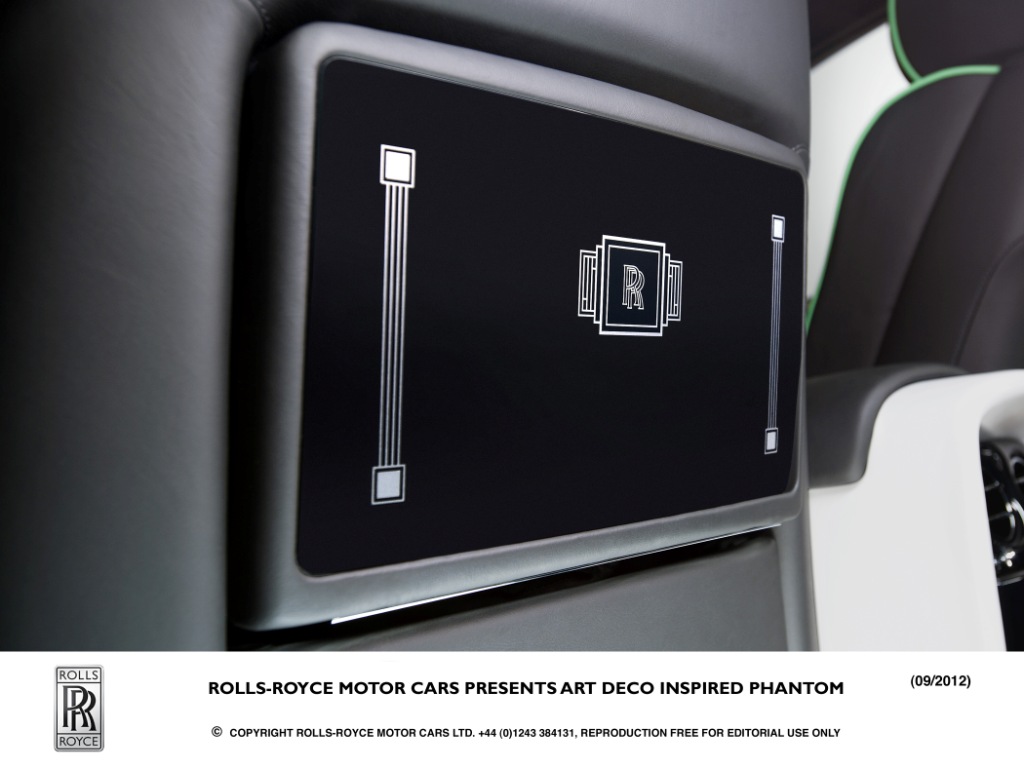 Phantom customers have a choice of several exterior colours including infinity black, Arabian blue, powder blue or Arctic white, and the exteriors feature a twin coachline with an Art Deco motif. An illuminated Spirit of Ecstasy mimicking ornamental glassware of the era, Art Deco headrest embroidery, bespoke inlays on piano black veneer and tread plates sporting Art Deco motif also add to the detailing.