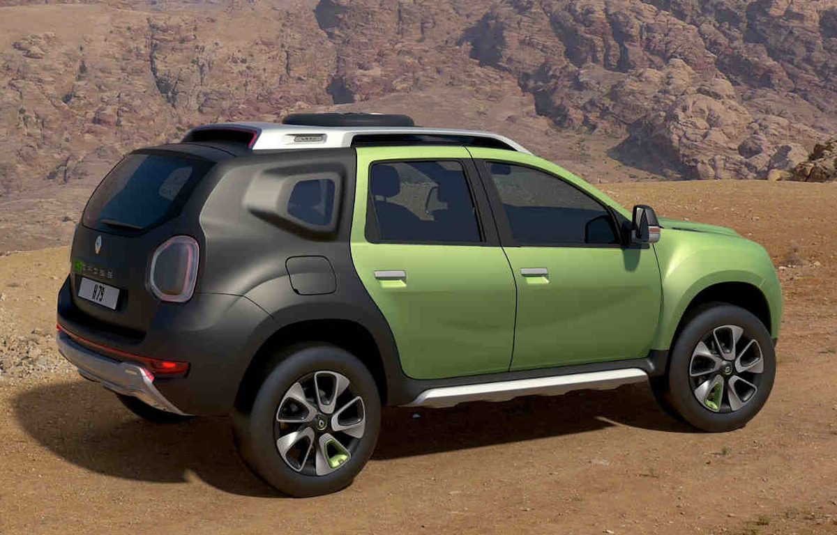 The exteriors of the DCross receive a bright green and matte black paint scheme. Improved off-roading abilities are suggested by the raised ride height, roof racks and a spare tyre atop the roof.