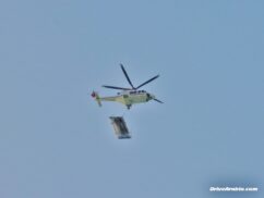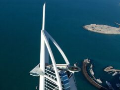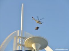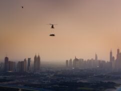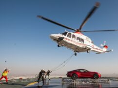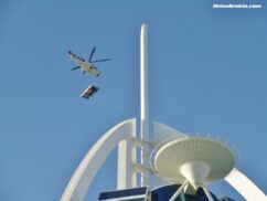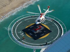 It’s the first time a car has been placed onto the helipad, which sits 300 metres above the ground at the top of the sail-shaped building. And if you’re wondering how they got it down, we saw the helicopter show up again an hour later, and after a few attempts in windy conditions, it successfully hauled the car away again, likely back to the SkyDive Dubai base from where it took off, at the Dubai Marina.