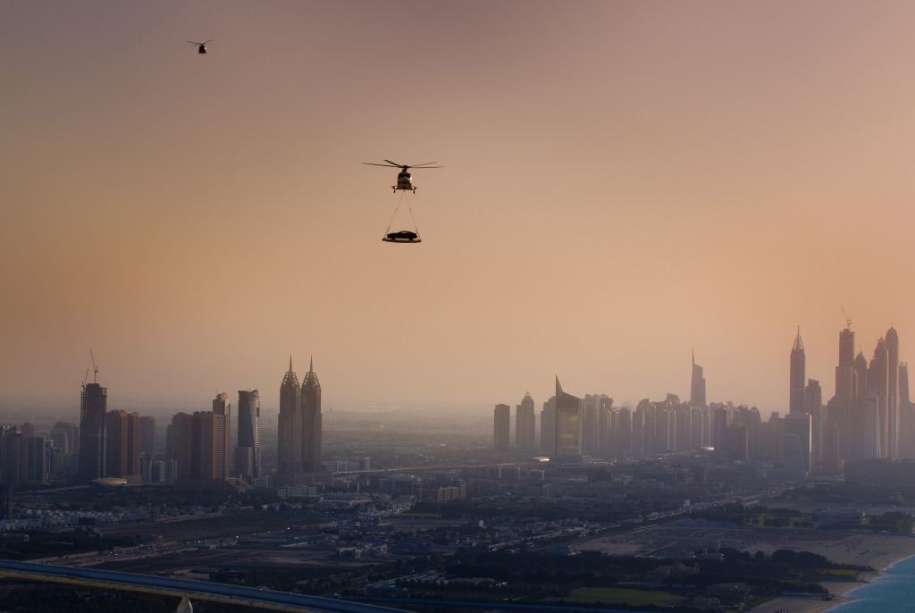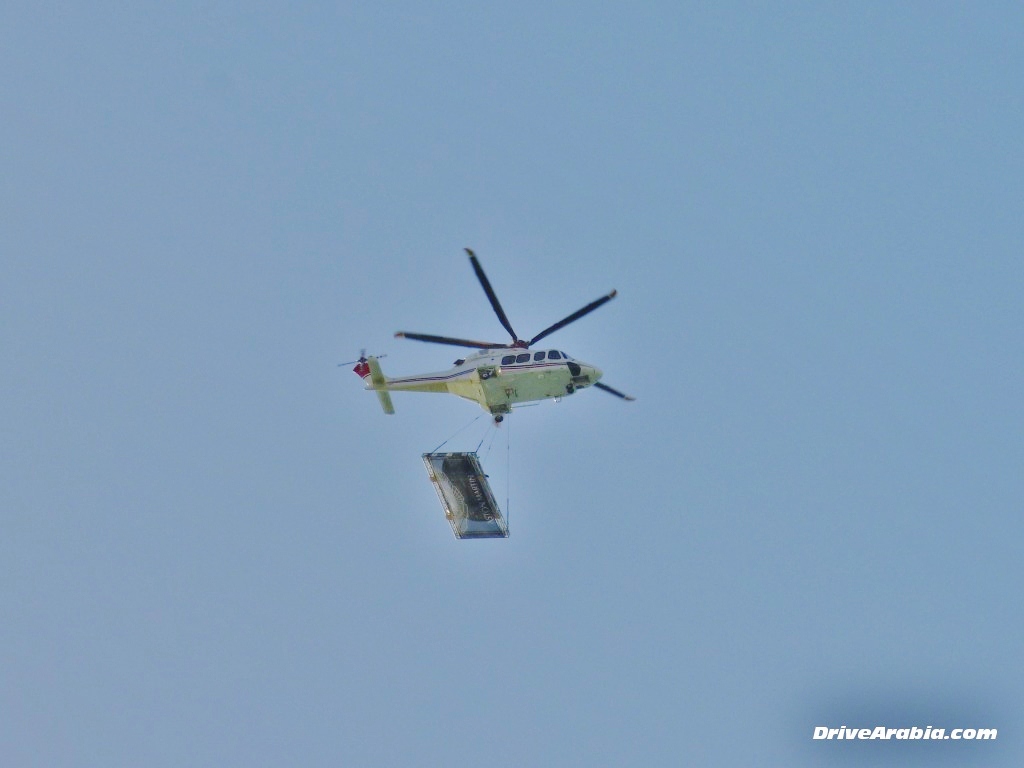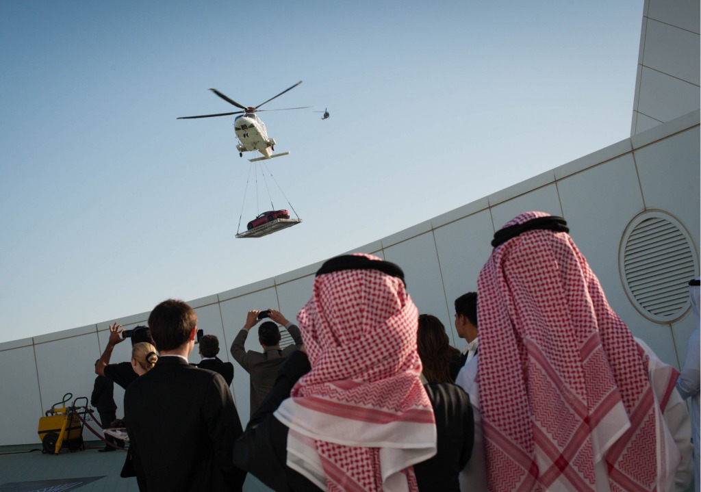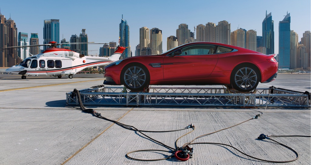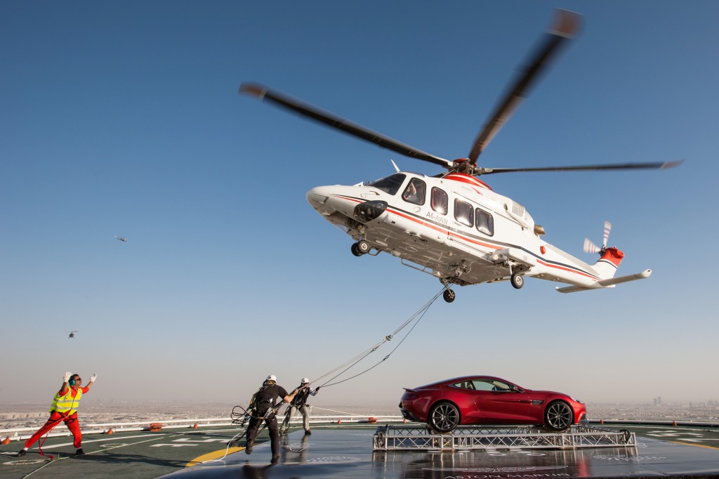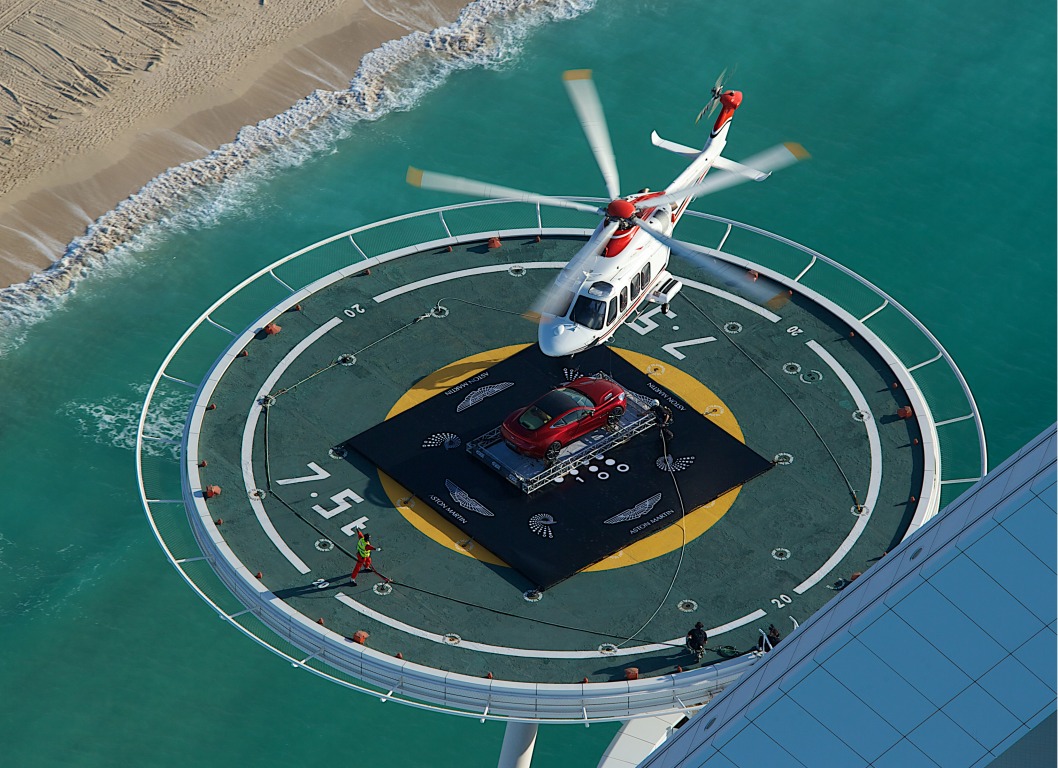 The event featured the airlift of the new Aston Martin Vanquish onto the helipad of the iconic Burj Al Arab hotel in front of regional dignitaries up there, with the media watching from below.