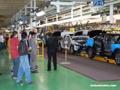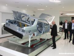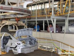 We skipped over the paintshop for fear of contamination and headed straight to the place where the car’s interior, exterior trim and electronics were fitted. There’s a slow-motion train of partially-built car bodies going around the building over several floors like some sort of complicated indoor theme-park ride, eventually ending up on the ground floor in a straight-moving assembly line where humans finally stick on all the interior panels, wire all the electronics, and stick on all the exterior trim, with a quick final check done by a bunch of men who finally drive it out to a small test track to give each car a brief road test.