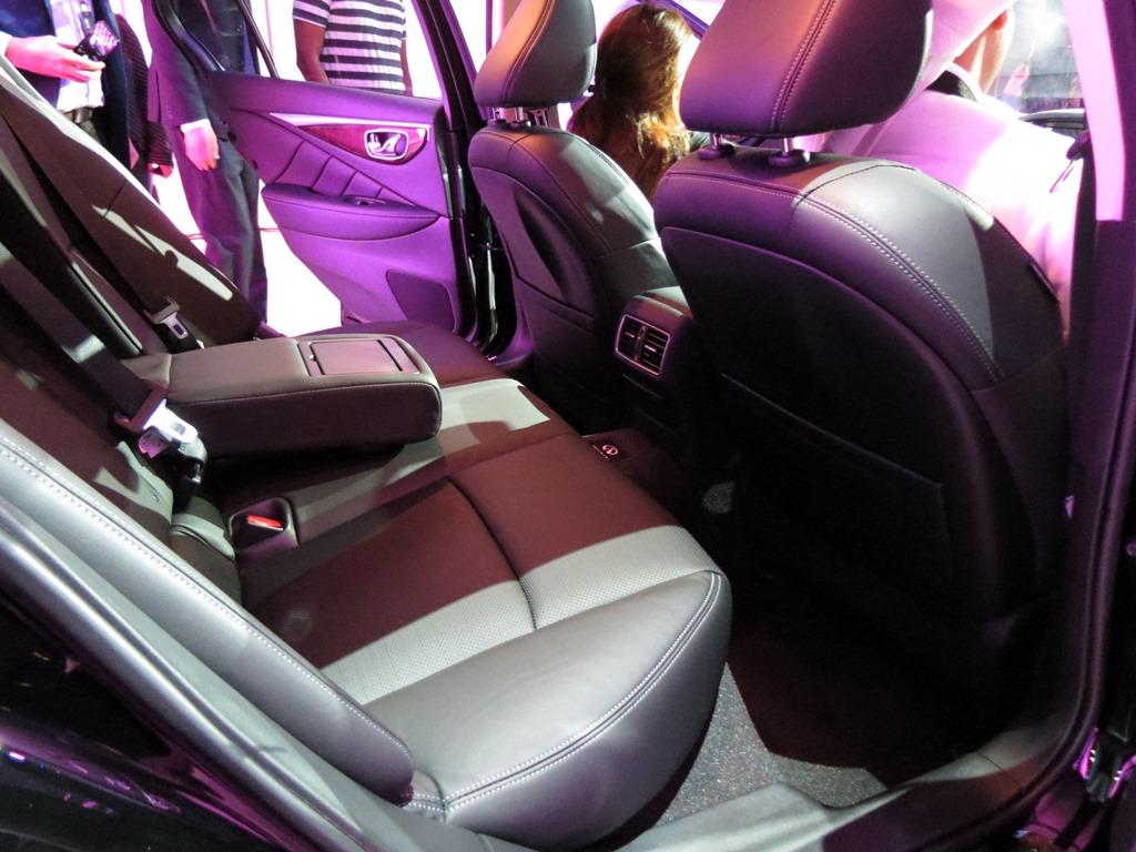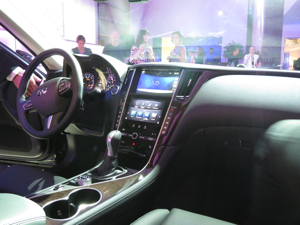 The interior of the Q50 is nicely appointed, with soft-touch materials and leather padding in all the right areas, unlike the new Lexus IS. The lower panels all throughout are hard plastics. The interior seemed spacious enough, with fairly good legroom and headroom for both front and rear passengers. The center console houses two touchscreens, one for the navigation system and reverse-camera, and the lower screen featuring Infiniti’s INTOUCH system.