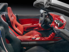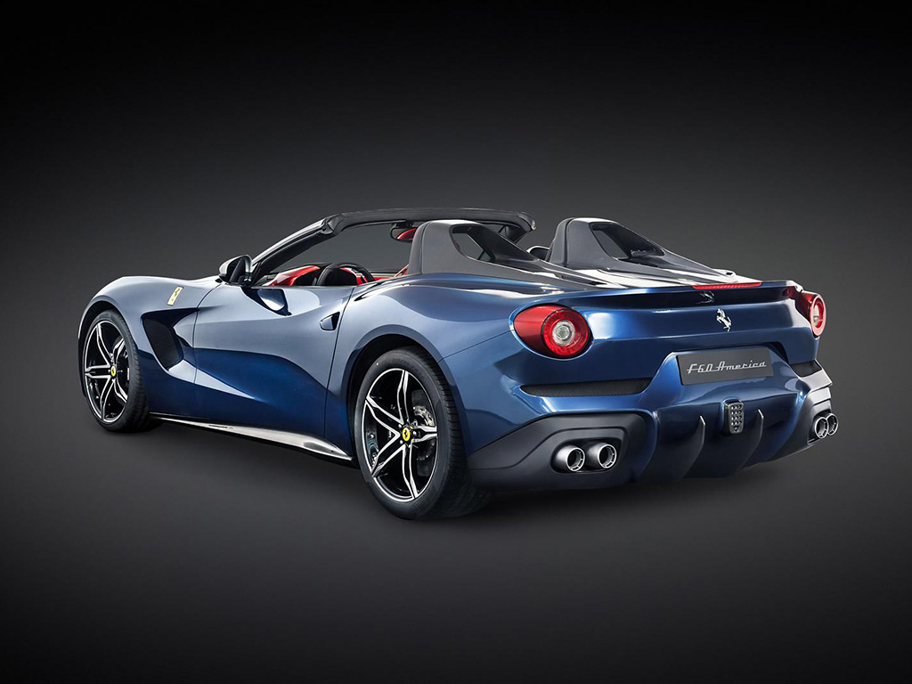 The F60America is basically a convertible version of the F12 Berlinetta. Ferrari has installed two roll-hoops wrapped around in leather. The front and rear fascias are slightly modified from the coupe, while the interior gets a red and black theme. The racing seats also feature a stylised American flag motif on the centre of each seat and backrest.