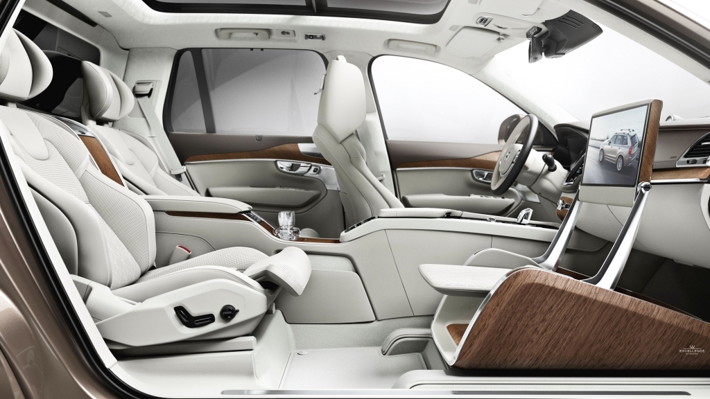 The S90 Excellence, intended to be a chauffeur-driven car, is missing a front passenger seat and comes with a full panoramic roof, foldout worktables, clever storage, a heated and cooled cup holder, an adjustable footrest and a built-in entertainment system featuring a large display for work or entertainment purposes. The S90 Excellence also includes a rear-seat touchscreen control interface, a built-in refrigeration compartment and handmade crystal glasses from Swedish glassmaker Orrefors.