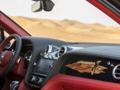 Inside the Bentayga’s “Hotspur hide” trimmed cabin, there is a removable transportation perch and tether on the central armrest. The sweeping desert scene on the dash was created using 430 individual pieces of wood sourced from all over the world and hand-crafted over nine days, so no two dashboards will be the same.