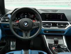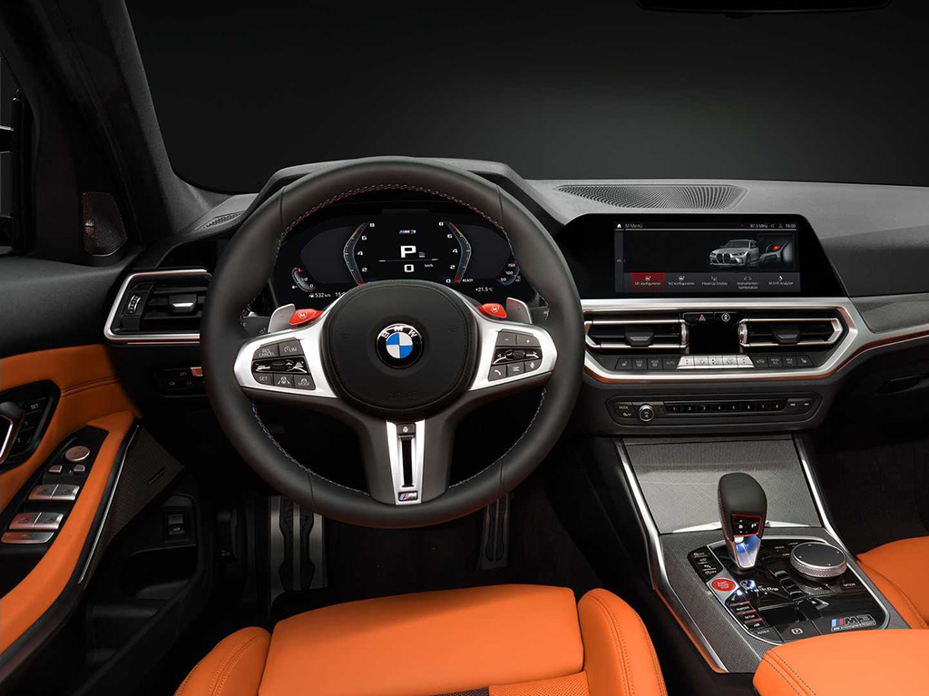 Most interior features from the standard BMW 3-Series (and 4 Series) are carried over, such as the central touchscreen and digital instrument cluster, with subtle touches such as a red start button, optional carbon fibre trim pieces, M badging throughout the cabin and red M Mode buttons on the steering wheel to cycle between Road, Sport and Track settings.