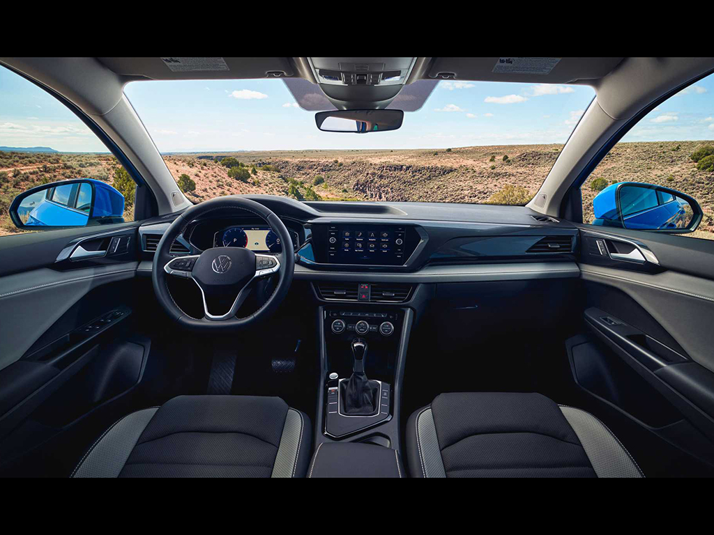 The VW Taos gets an optional IQ.Drive Safety Suite featuring forward collision warning with automatic emergency braking, lane-keeping assist, blind-spot monitoring, automatic high beams, and adaptive cruise control.