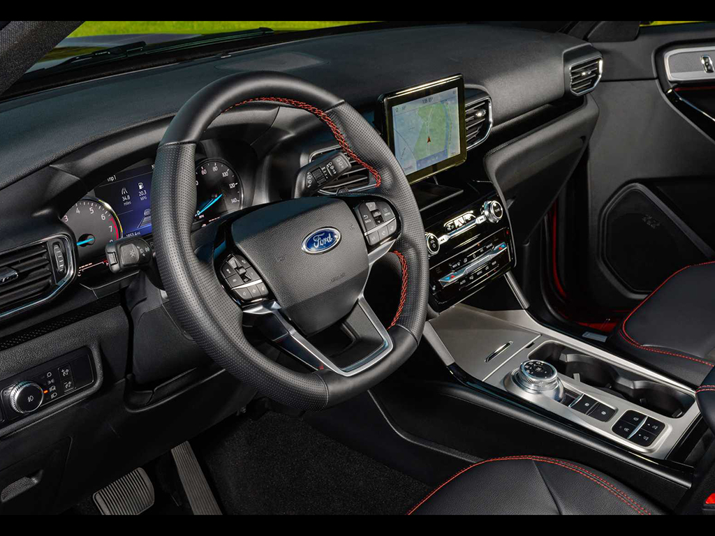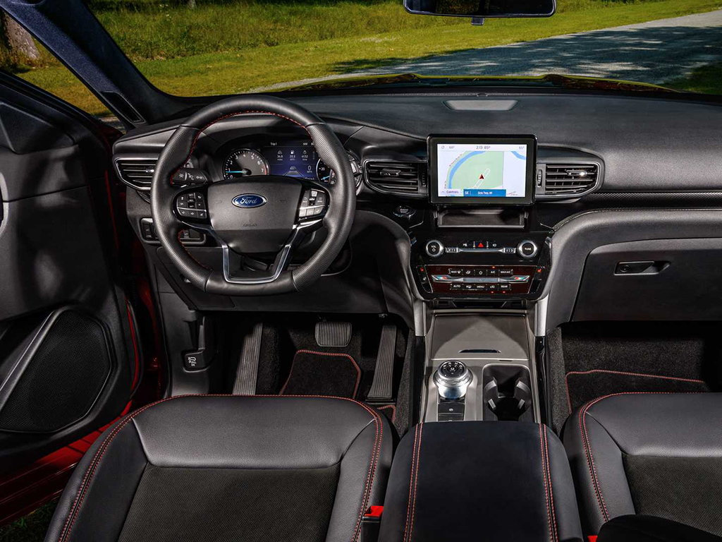 New tech like a 360-degree camera, heated steering wheel, wireless charging, auto-dimming rear-view mirror, and heated front seats find their way into the cabin of the Explorer ST-Line. To make matters more interesting, a 12-speaker Bang & Olufsen stereo system is also thrown into the package.