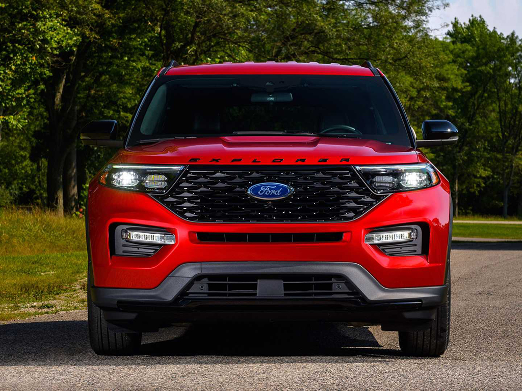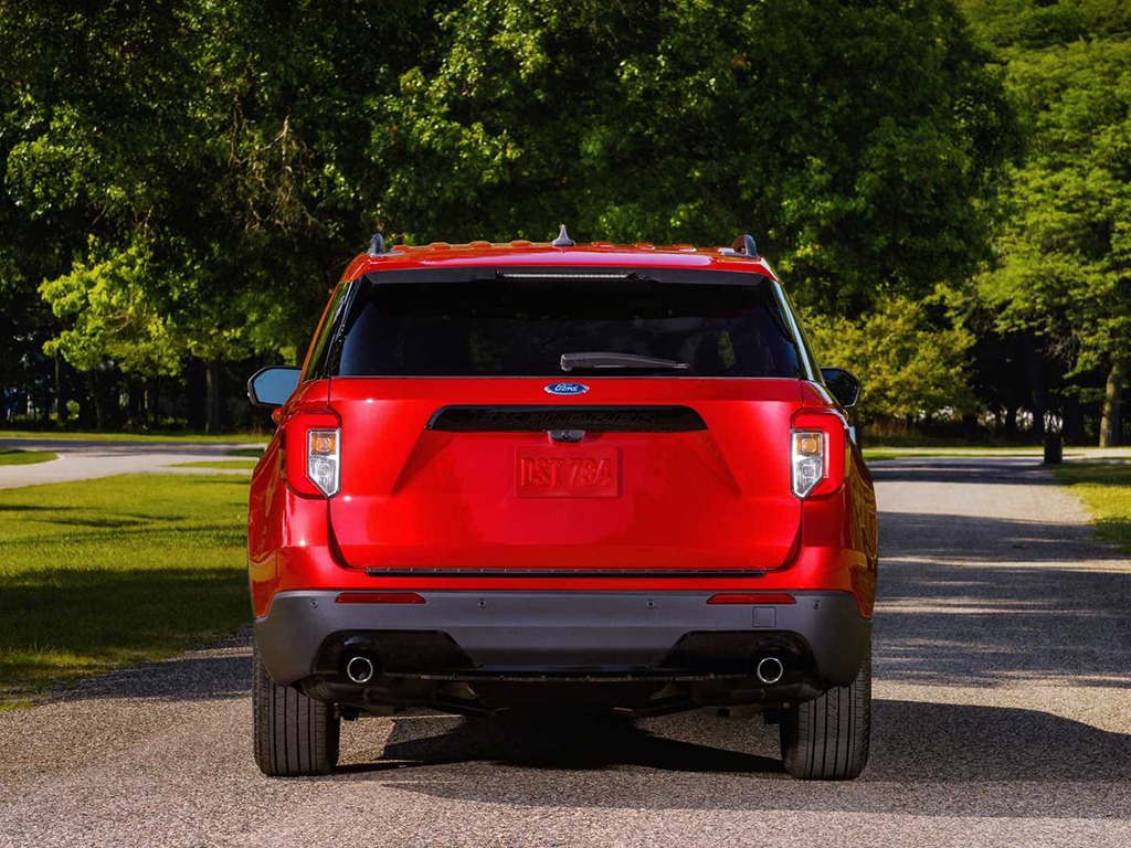 The Explorer ST-line comes with a completely blacked-out grill, dual exhaust tips, 20-inch alloy wheels, and an ominous dark tint on the headlights and taillights. The Explorer badge is written wide on the hood, with black lettering.