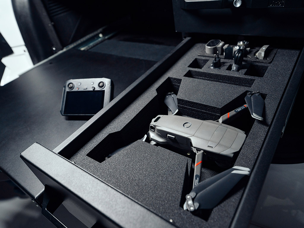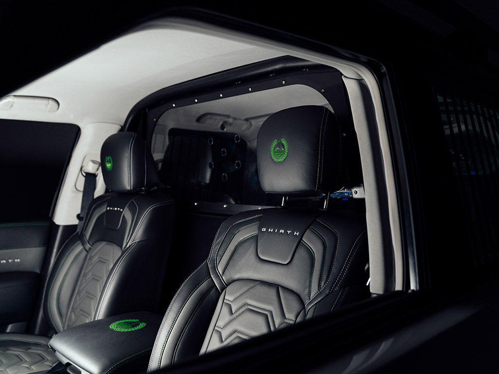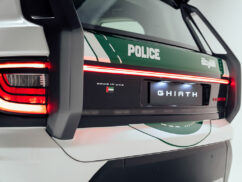 The interior was designed around the comfort and needs of police officers, with an integrated 16-inch central screen, a powerful onboard computer linked to the main control centre, a large passenger display, an android tablet connected to the dispatcher, a driver behaviour camera, in-cabin monitoring and front ADAS. The Ghiath Smart Patrol also features a custom-built rear bench, grills, a protective cage, a specially designed compartment in the boot to store rescue and safety equipment, as well as a custom-built drone box with an advanced drone on board.
