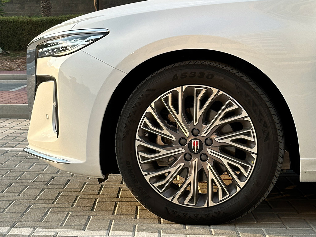 This mid-size sedan makes a bold statement with distinctive exterior features like its toothy front grille slapped with a large Hongqi emblem and crisp creases running along its sleek body fitted with edgy-looking angular LED lights, all of which render a dynamic, aggressive appearance.