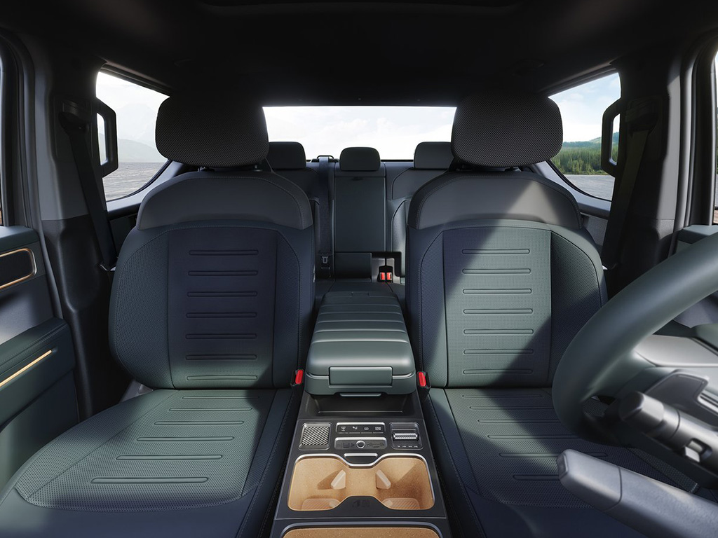 Kia’s design team has created a unique look for the Tasman, steering away from the oversized styling of many pickups. Up front, the truck sports Kia’s distinctive “Tiger Face” grille with vertical lighting elements integrated into the headlamps.