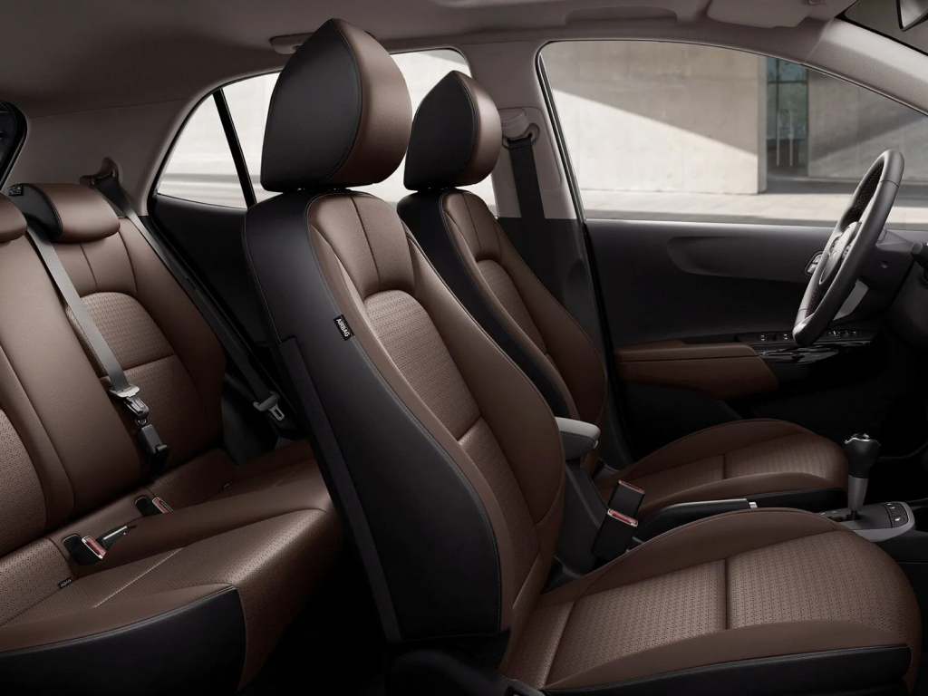 The higher trim includes an artificial leather-wrapped steering wheel, driver cluster, artificial leather seating with heating and cooling, and chrome finishes around the cabin.