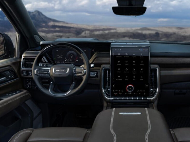 The interior is uniquely spacious, with seating for up to nine passengers depending on configuration. Higher trims, like Denali Ultimate, feature full-grain leather upholstery, open-pore wood accents and a 16-way power-adjustable driver’s seat. The infotainment system is centered around a 13.4-inch touchscreen with wireless Apple CarPlay, Android Auto and Google Built-In.